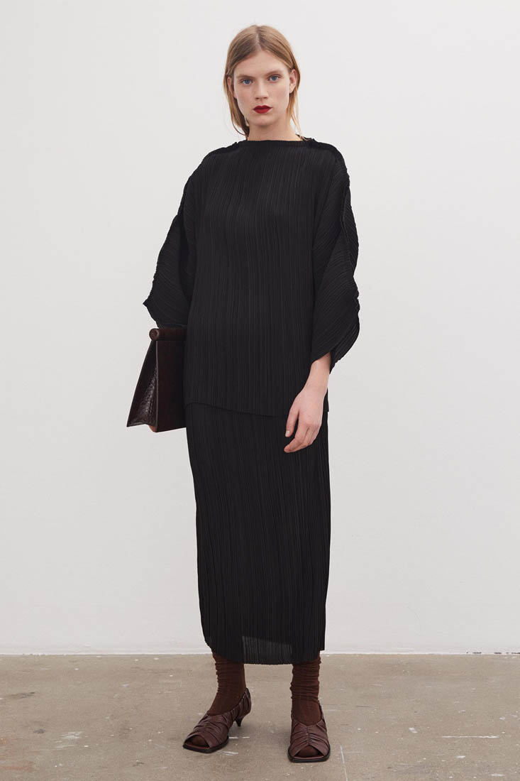 Med en stilren boat-cut halsringning har denna avslappnade plisséskjorta en minimalistisk känsla. De överdimensionerade ärmarna bidrar ytterligare till den avslappnade formen på stycket. Bär din med de koordinerande byxorna.