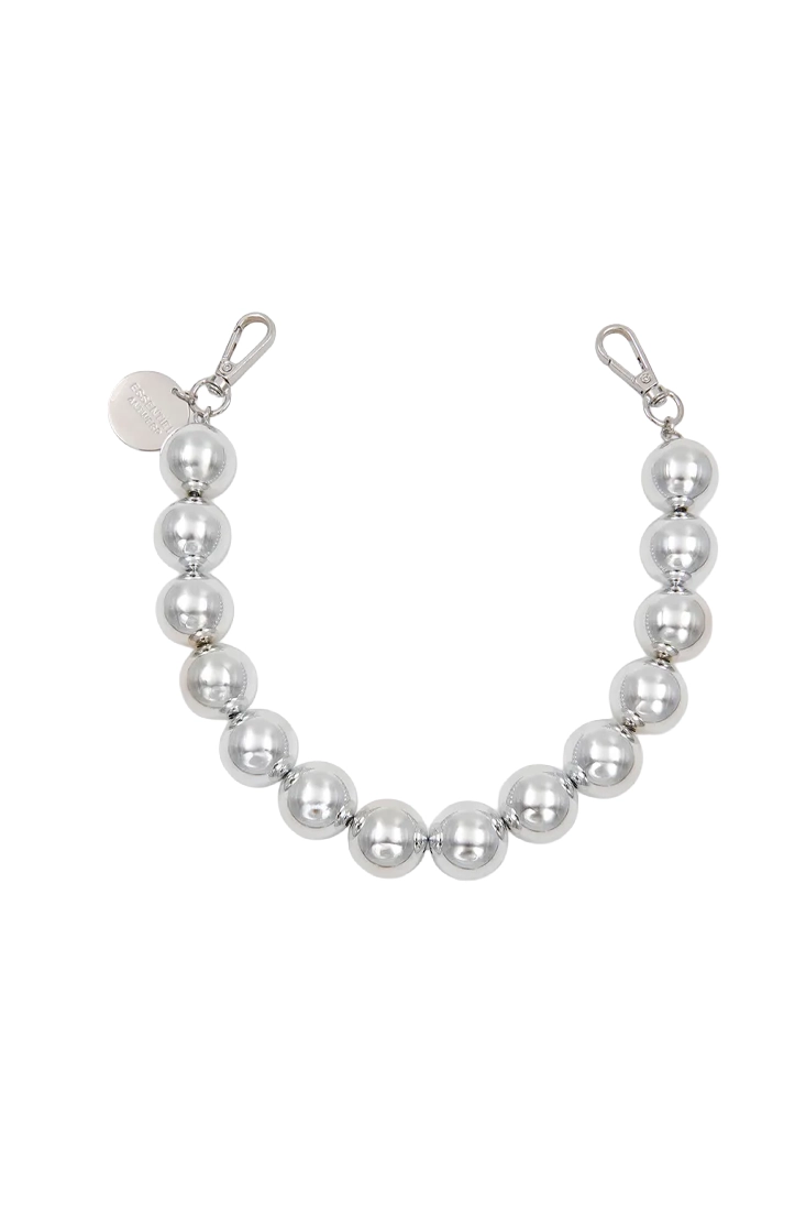 Halsband med stora, blanka pärlor i silverton som även kan användas som väskdekoration. De runda formerna ger ett modernt uttryck och kompletteras med en liten charm. Utrustat med två karbinhakar så det enkelt kan fästas runt halsen eller på en väska.