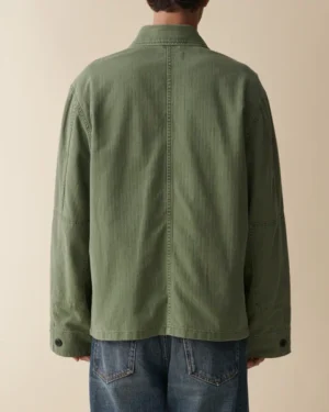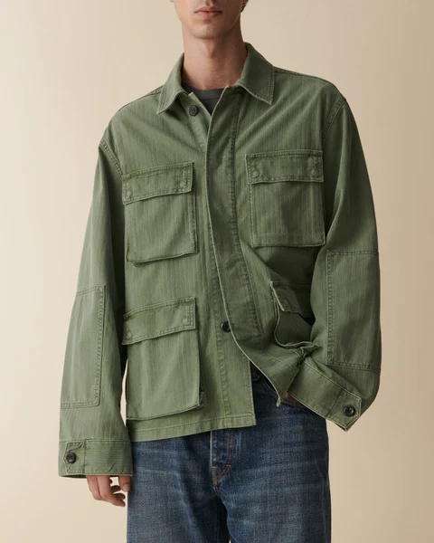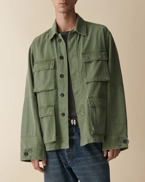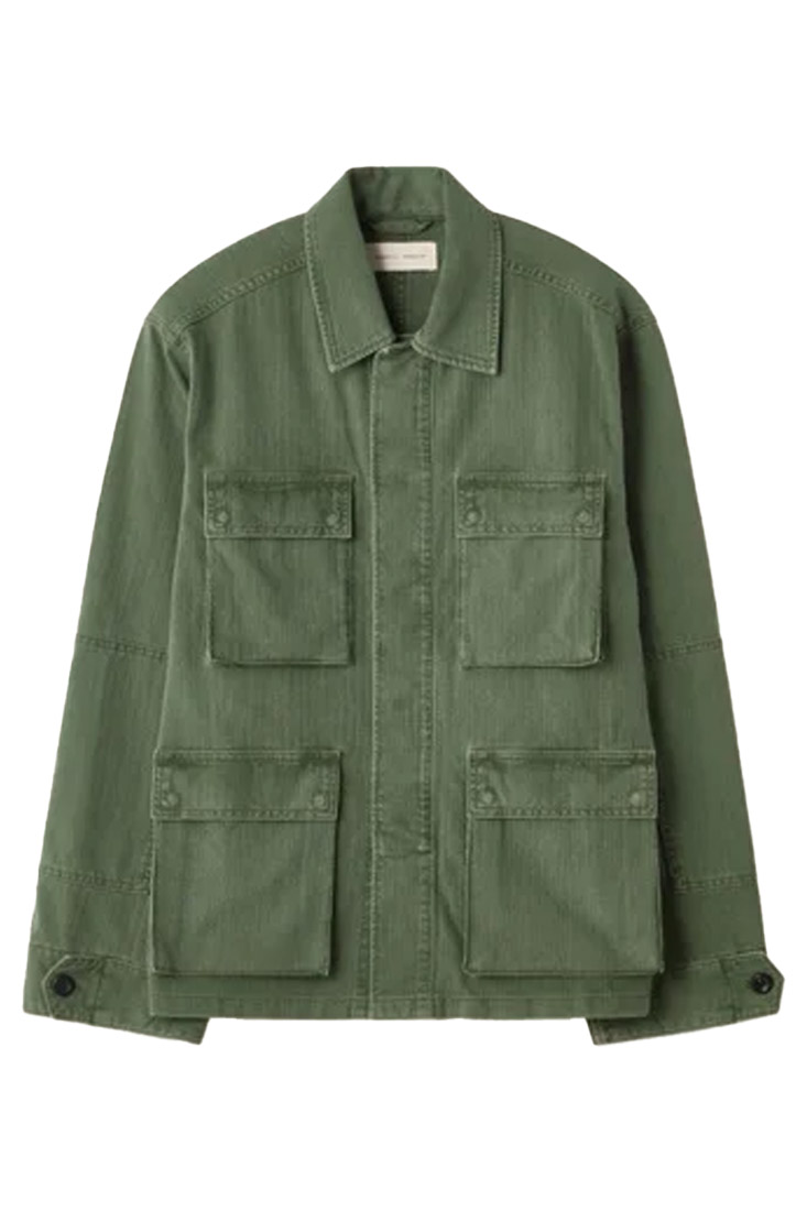 Luc är en arméinspirerad jacka med en lätt figurnära siluett. Modellen är ofodrad, vilket gör den perfekt för varmare dagar. Den har ärmpatchar, dold knäppning framtill, justerbara manschetter och stora utanpåliggande fickor som förstärker den funktionella känslan.