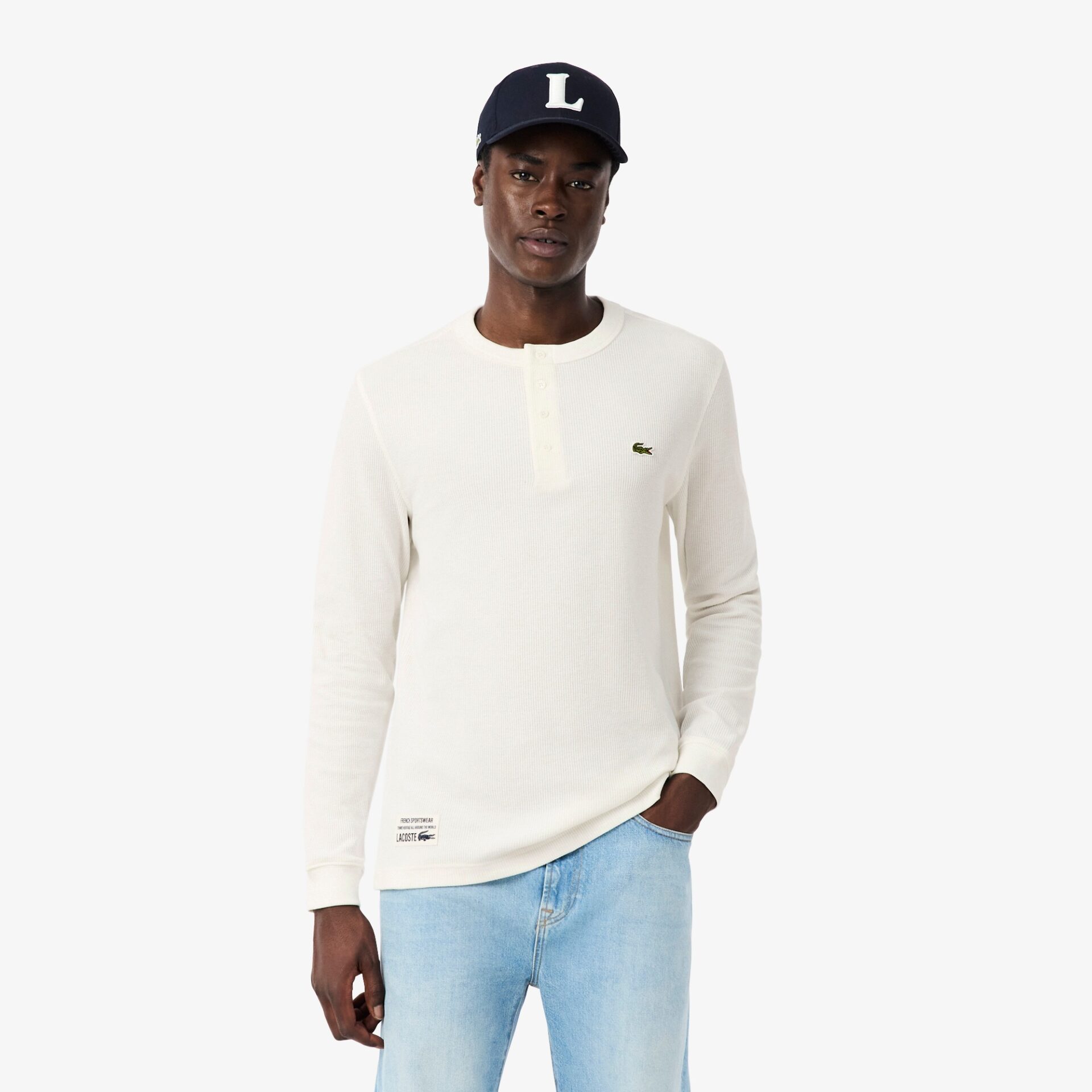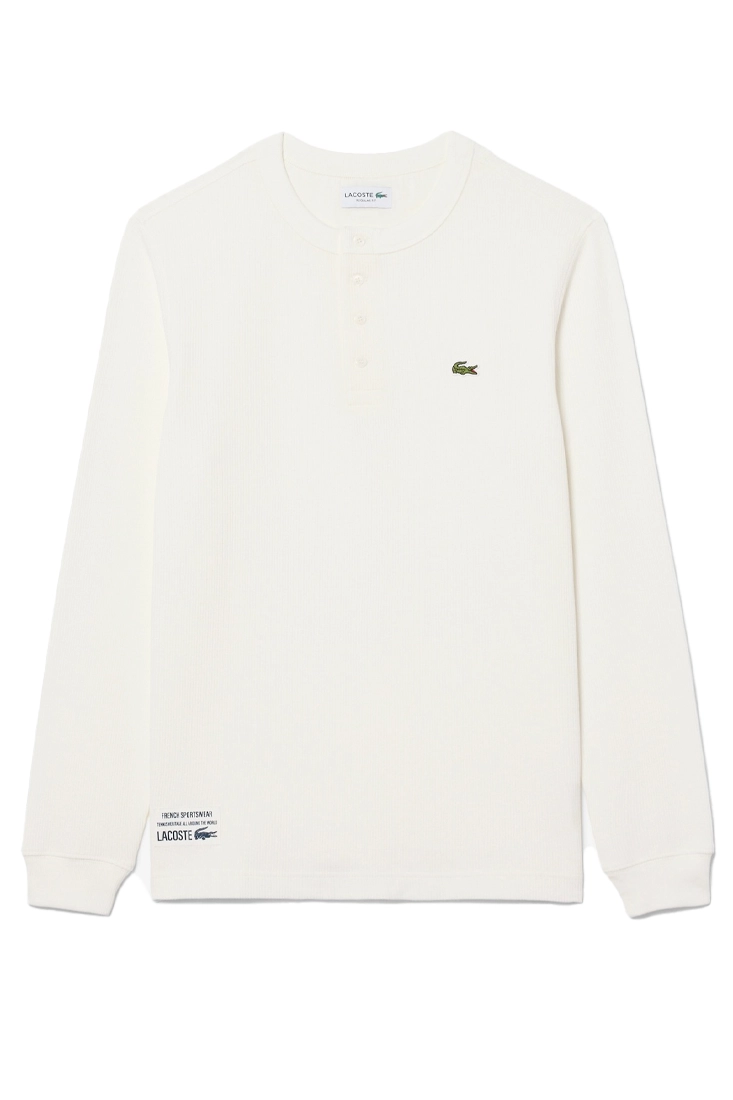 Långärmad Henley T-shirt är ett grundplagg i herrgarderoben från Lacoste. Tillverkad i en mjuk, waffle texturerad bomullsblandning som ger både komfort och en elegant känsla. Klassiska pärlemorknappar vid halsen, broderad krokodil på bröstet och märkning vid midjan ger en sofistikerad finish.