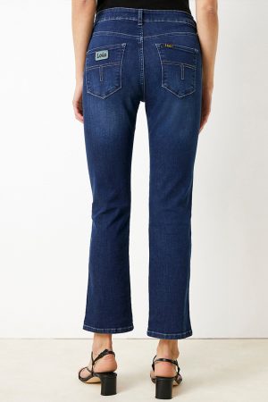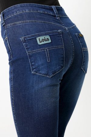 Malena från Lois i en mörkare denim färg. Modellen har rakt ben, dragkedja i gylfen och normal midjehöjd. Benlängden är ankellång och en 32 längd är som en 30 längd. Malena är en jeansmodell som passar för varje säsong. Normal i storlek men töjer sig.