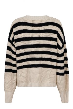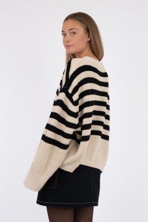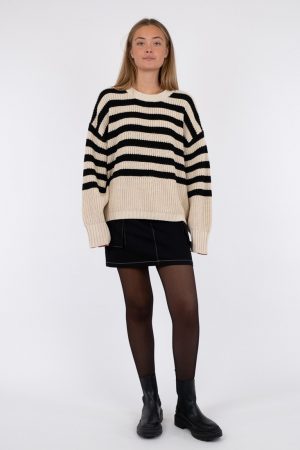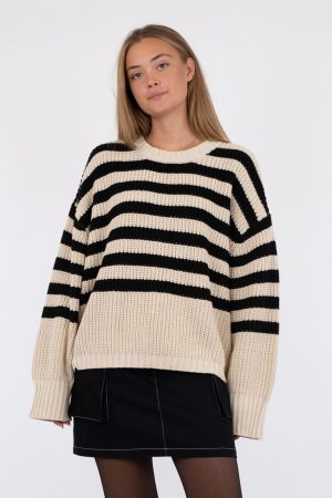 Stickad bredrandig tröja i svart och beigt från Neo Noir. Tröjan är oversized och rak i passformen. Rundhals och har mudd nertill. Vid ärmslut en bredare mudd som fin detalj. Den är stor i storlek pga att modellen är oversized.