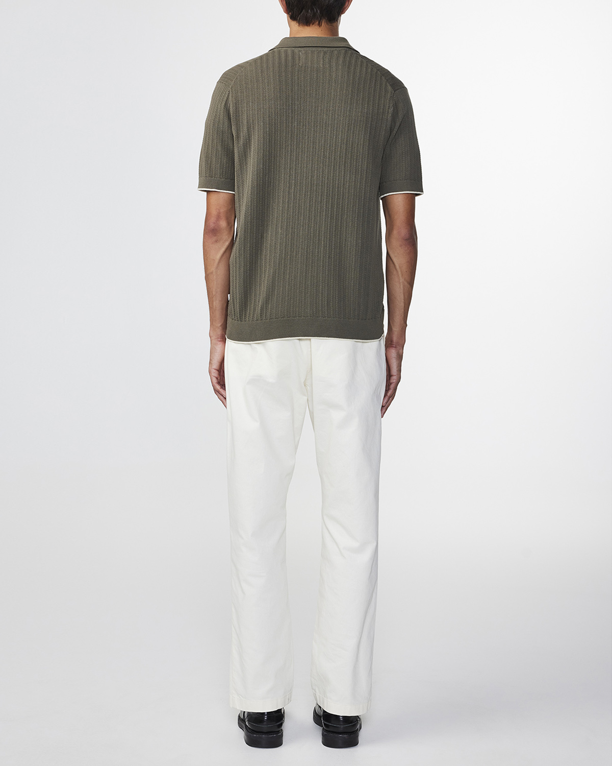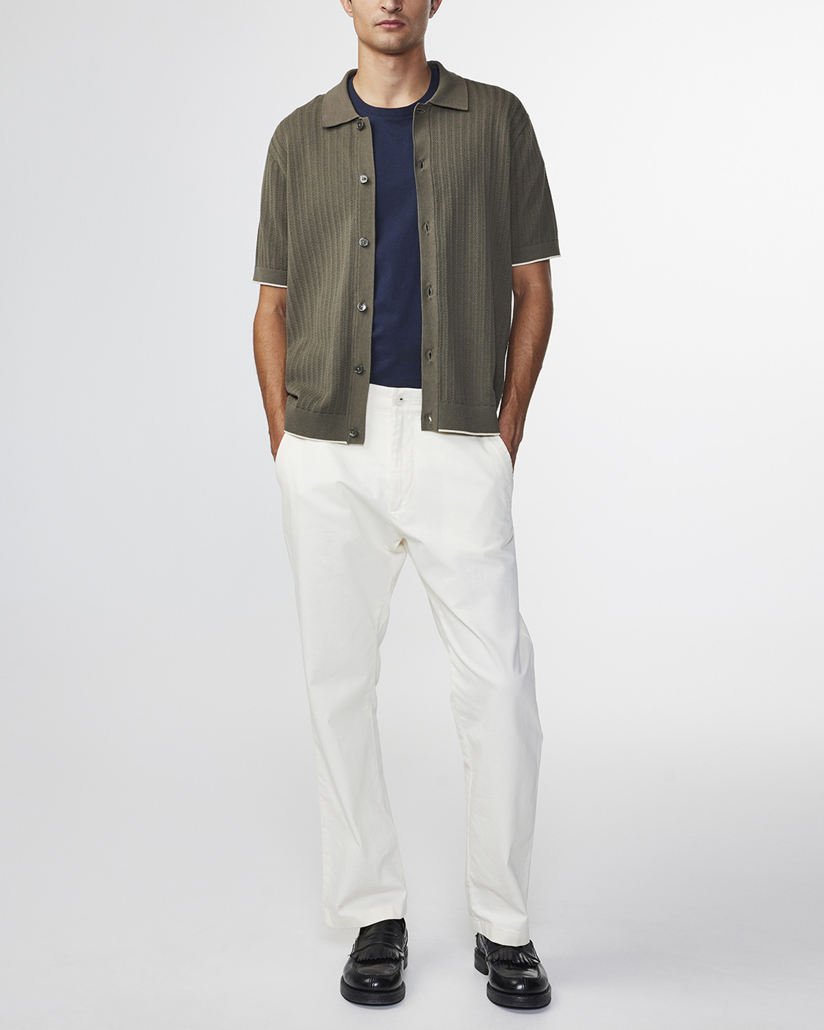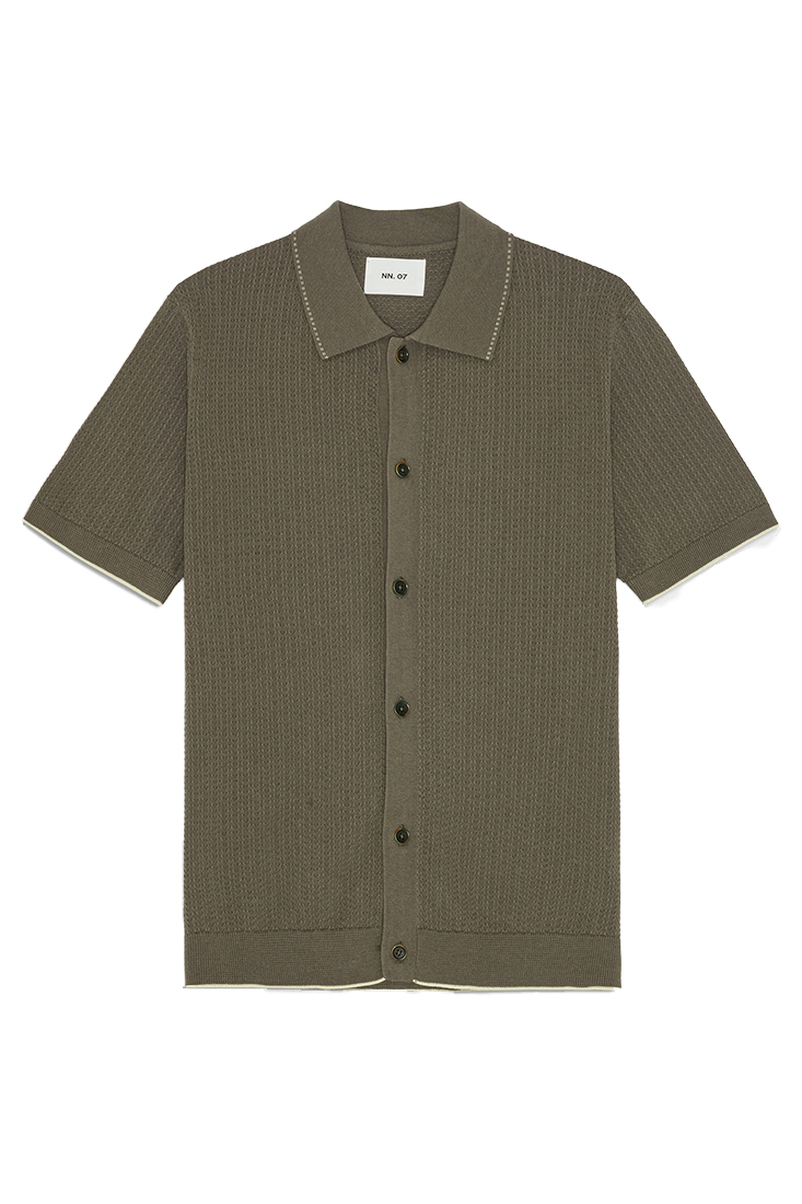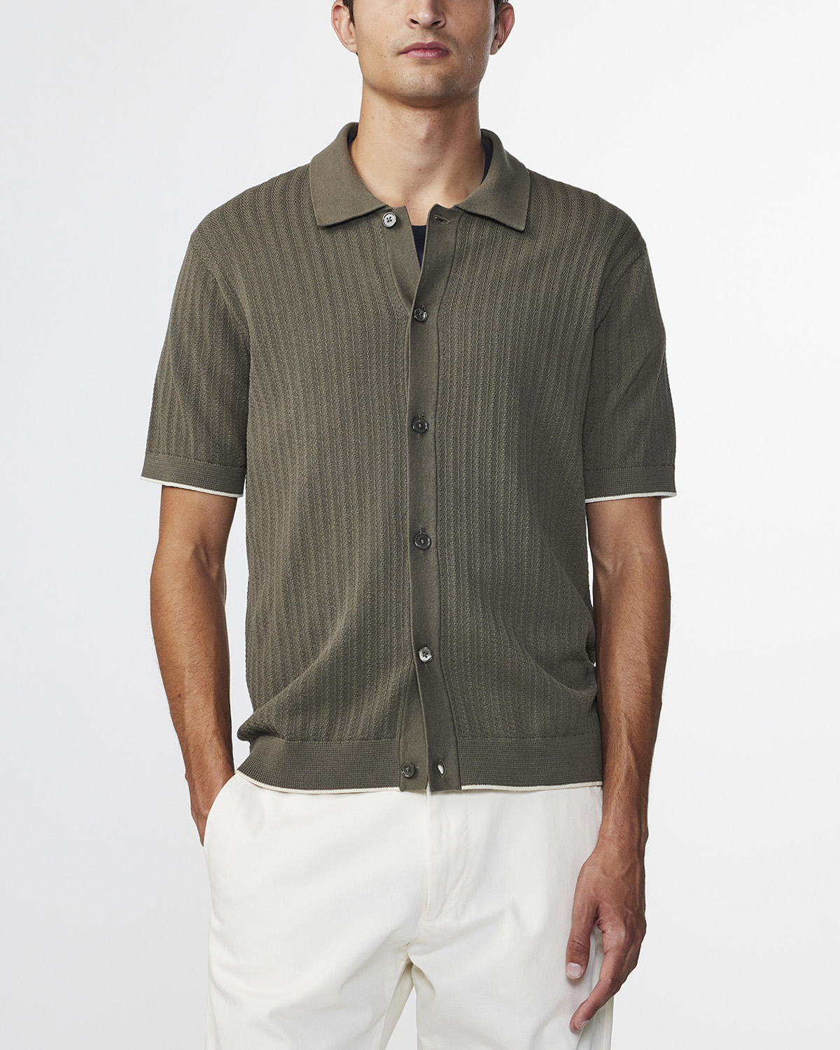 En bomullspiké i regular passform med en krispig, texturerad stickning som känns lätt och sval mot huden. Modellen har kontrastdetaljer och en ren knappslå med Corozo-knappar som ger ett avslappnat men välklätt uttryck. En perfekt piké för både vardag och ledigare tillfällen.