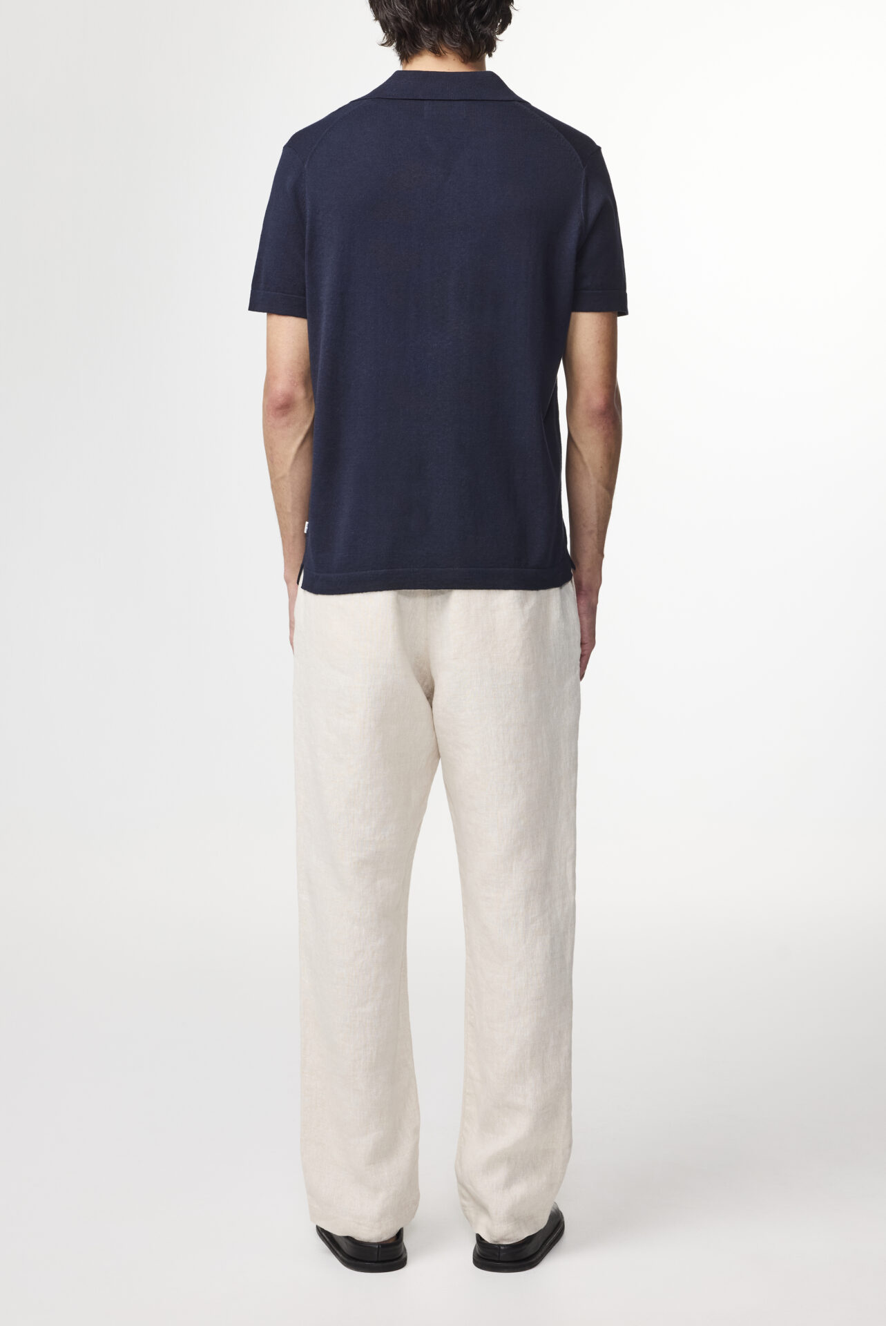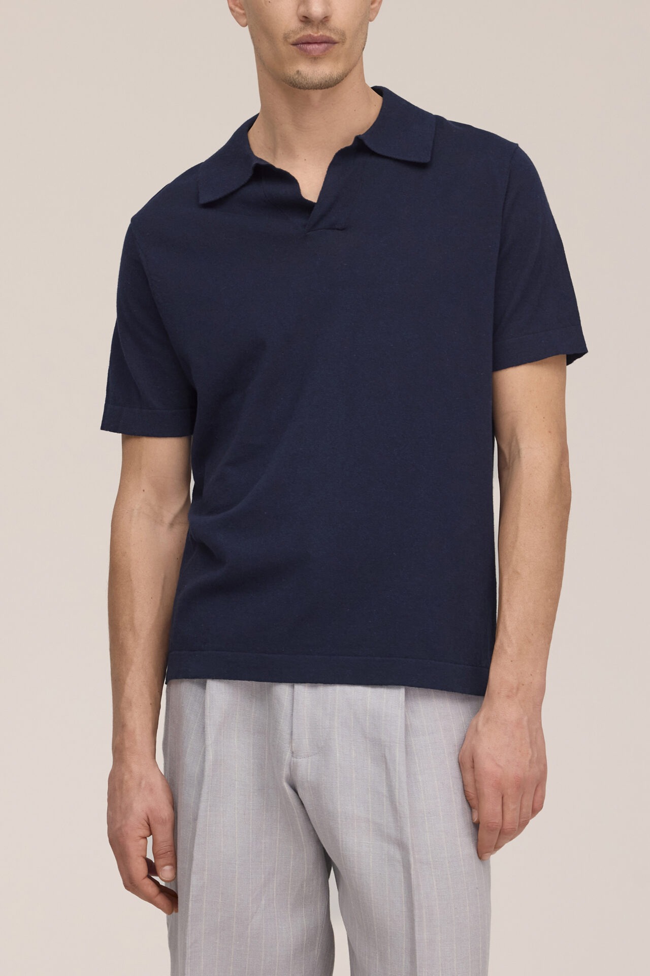 Stickad tröja med öppen V-ringning och krage, tillverkad i en blandning av bomull och linne. Stickningen har en lätt och luftig struktur som känns behaglig att bära. Uppdaterad med bred krage och avslutad med tubstickade detaljer vid ärmslut och nederkant.