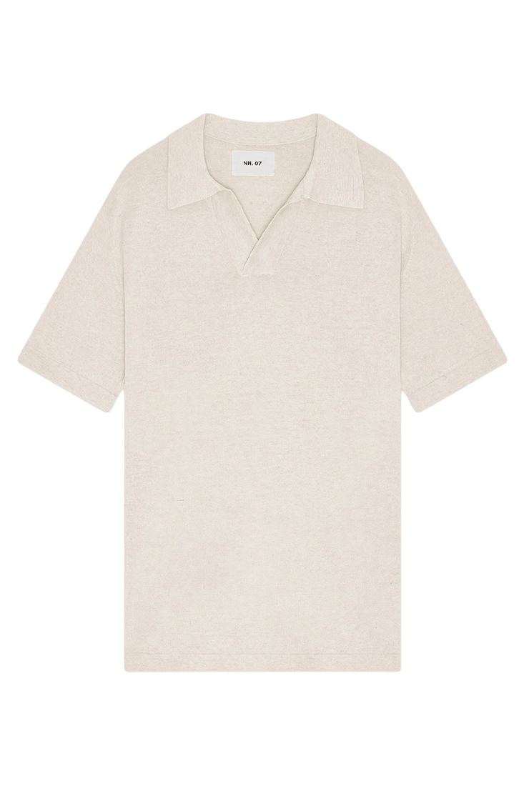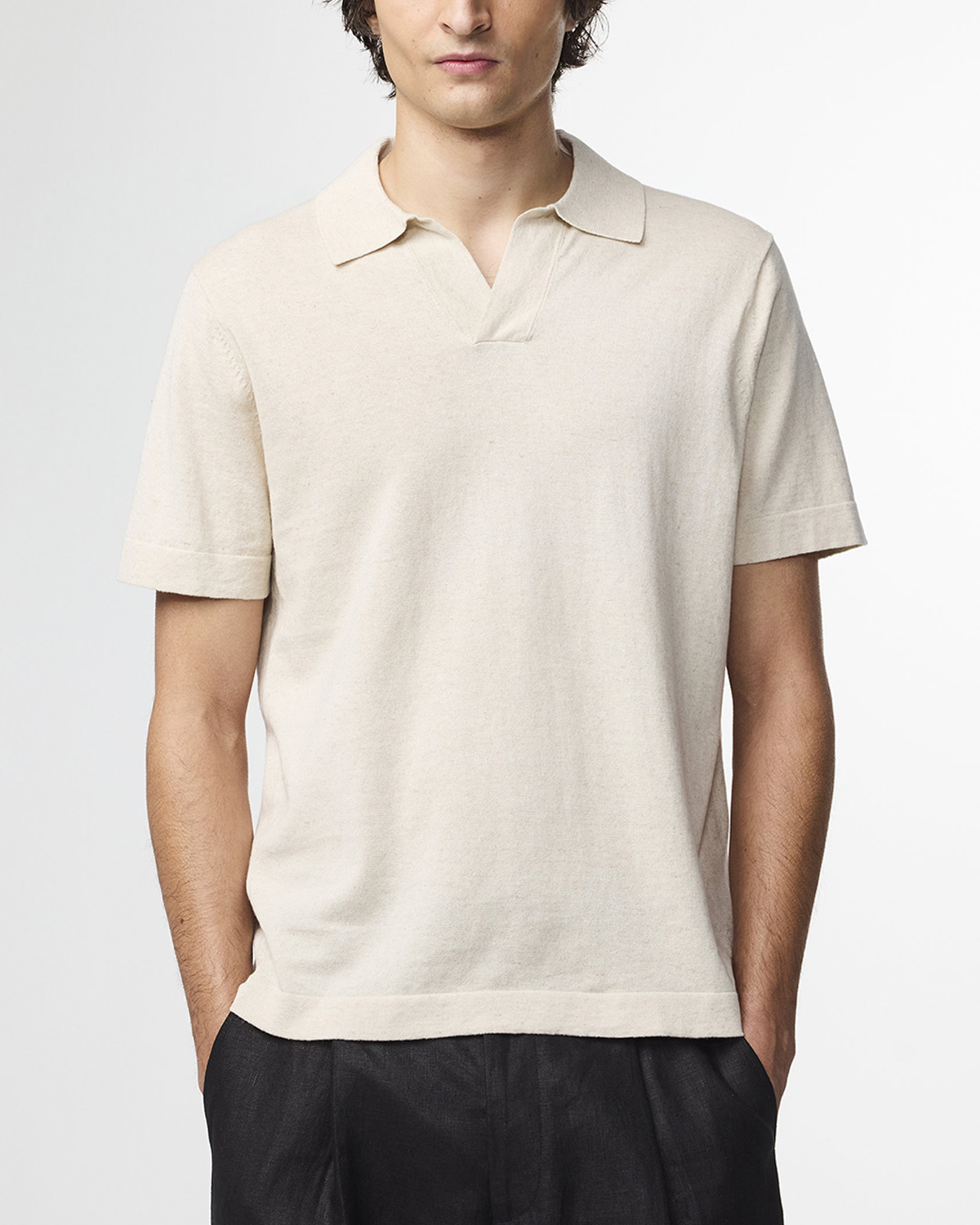 Stickad tröja med öppen V-ringning och krage, tillverkad i en blandning av bomull och linne. Stickningen har en lätt och luftig struktur som känns behaglig att bära. Uppdaterad med bred krage och avslutad med tubstickade detaljer vid ärmslut och nederkant.