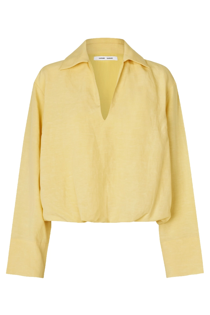 Fin gul blus från Samsøe Samsøe med krage och djupare v-ringning. Fint avslut med liten ”volang” nertill. På insidan sitter en resårkant nertill. Rak ärm men lite bredare manschett och två knappar. Rak passform och något stor i storlek.