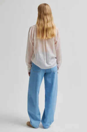 Randig skjorta från Second Female i en halvtransparent lyocellblandning med ränder över hela plagget. Modellen har klassisk krage, knäppning fram och långa ärmar med knappade manschetter. Framfållen är vriden för en modern detalj. Lös, avslappnad passform.