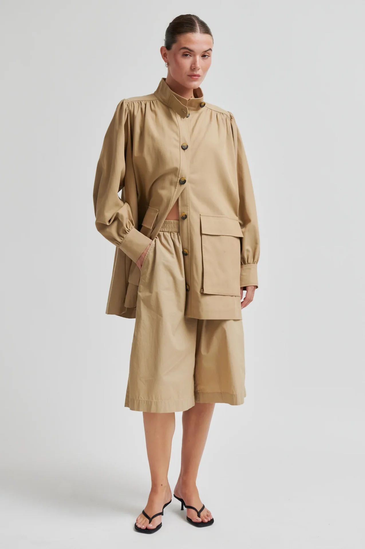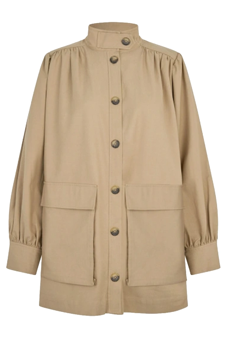Jacka från Second Female i en mjuk bomullsblandning. Modellen har hög krage och knäppning fram, med rynkade axlar och långa ärmar med manschetter. Utrustad med två fickor med lock samt dolda sidfickor. Lös och vid passform.